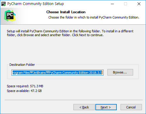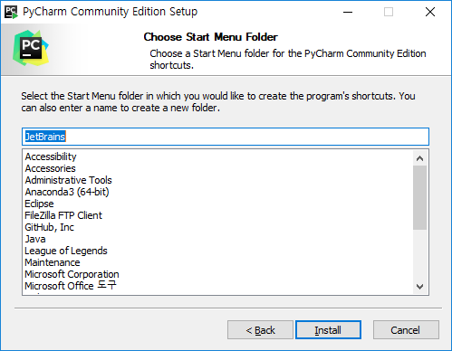 설치할 디렉토리명을 입력합니다.(실습에서는 PyCharm을 입력)