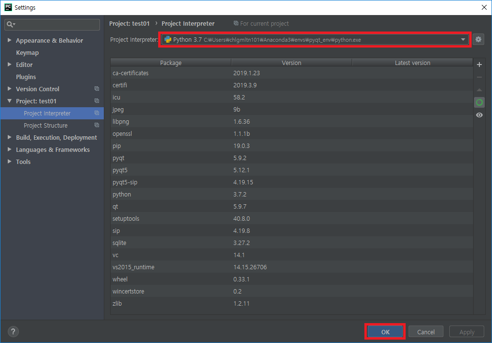 - Python Interpreter를 설정해준 Project Interpreter로 변경