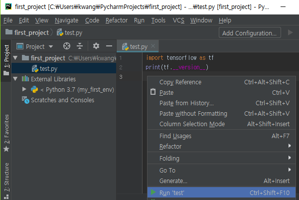 - 프로젝트별로 Python 버전 및 환경을 선택할 수 있다.