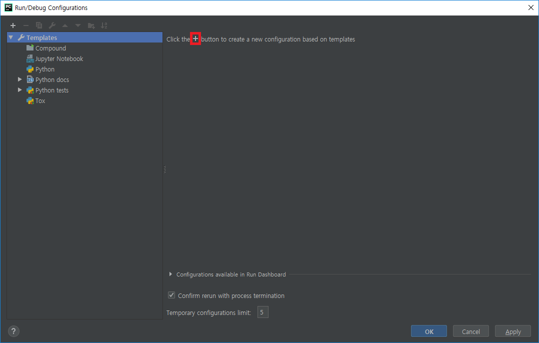 - 실행/디버그 구성(Run/Debug Configuration)이 없을 경우, Add Configuration 클릭