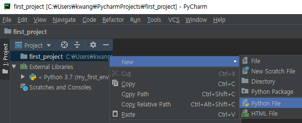 - 자신이 생성한 프로젝트 폴더 우클릭 후 New->Python File 생성