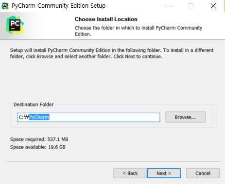 설치할 디렉토리명을 입력합니다.(실습에서는 PyCharm을 입력)