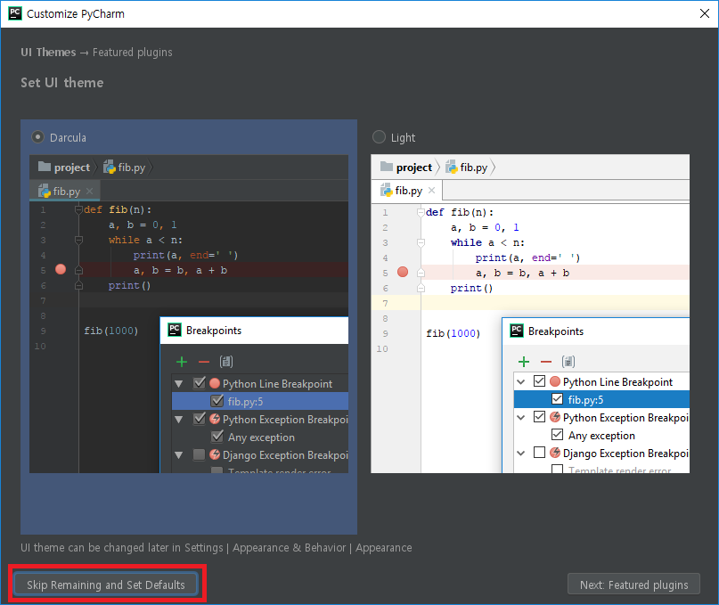 User Interface 테마를 선택합니다. (실습에서는 어두운 Darcula 선택)