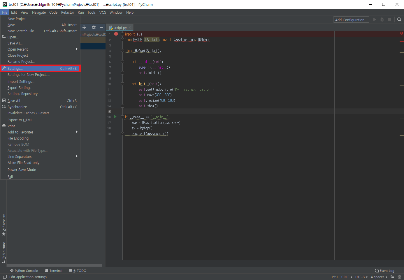 - 프로젝트 내부에서 File->Settings 클릭