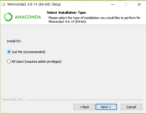 설치할 디렉토리를 입력합니다.실습은 현재 사용자 폴더 밑에 Miniconda3로 설치합니다.