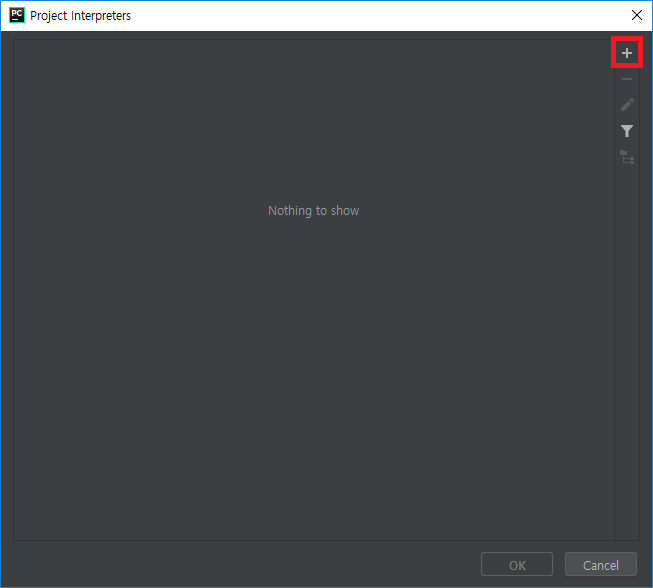파이썬 실행파일(인터프리터)을 추가하고자 나사버튼을 누르고 "Add"를 선택합니다.