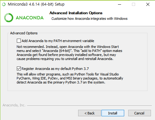 # 설치된 폴더로 이동합니다. $ cd C:\Users\kwang\Miniconda3\condabin # 아나콘다 버전을 확인합니다. $ conda -V conda 4.6.14 # 아나콘다 최신버전으로 업그레이드 합니다. # update: Updates conda packages to the latest compatible version. $ conda update conda # 가상환경을 만듭니다.(python 3.x버전이며 이름은 my_first_env입니다.) # create: Create a new conda environment from a list of specified packages. $ conda create -n my_first_env anaconda python=3