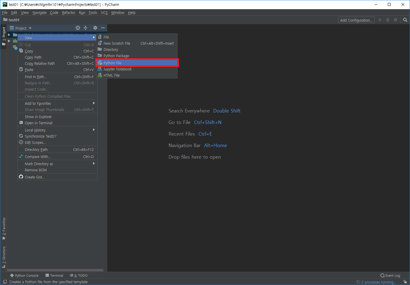 - 자신이 생성한 프로젝트 폴더 우클릭 후 New->Python File 생성