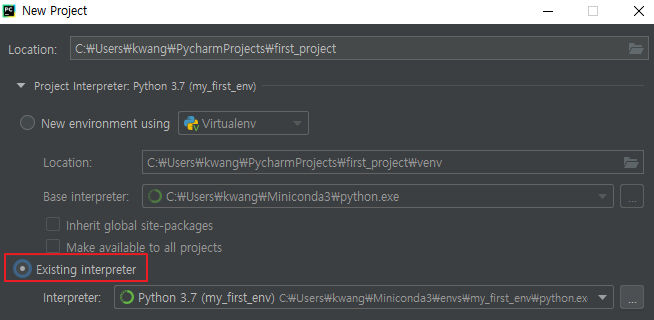 프로젝트 이름을 입력하고 인터프리터는 미리 등록해놓은 것을 선택합니다.(실습에서는 my_first_env를 선택)