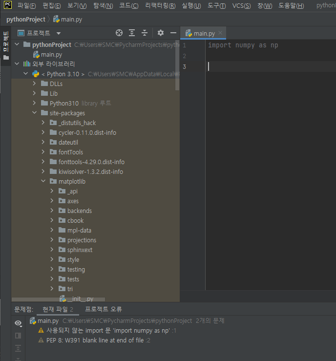 ※ 여담으로... 그렇게 애써 matplotlib을 설치하고 numpy를 import하려고 하니 에러가 뿜뿜하는 것처럼 보인다...:???