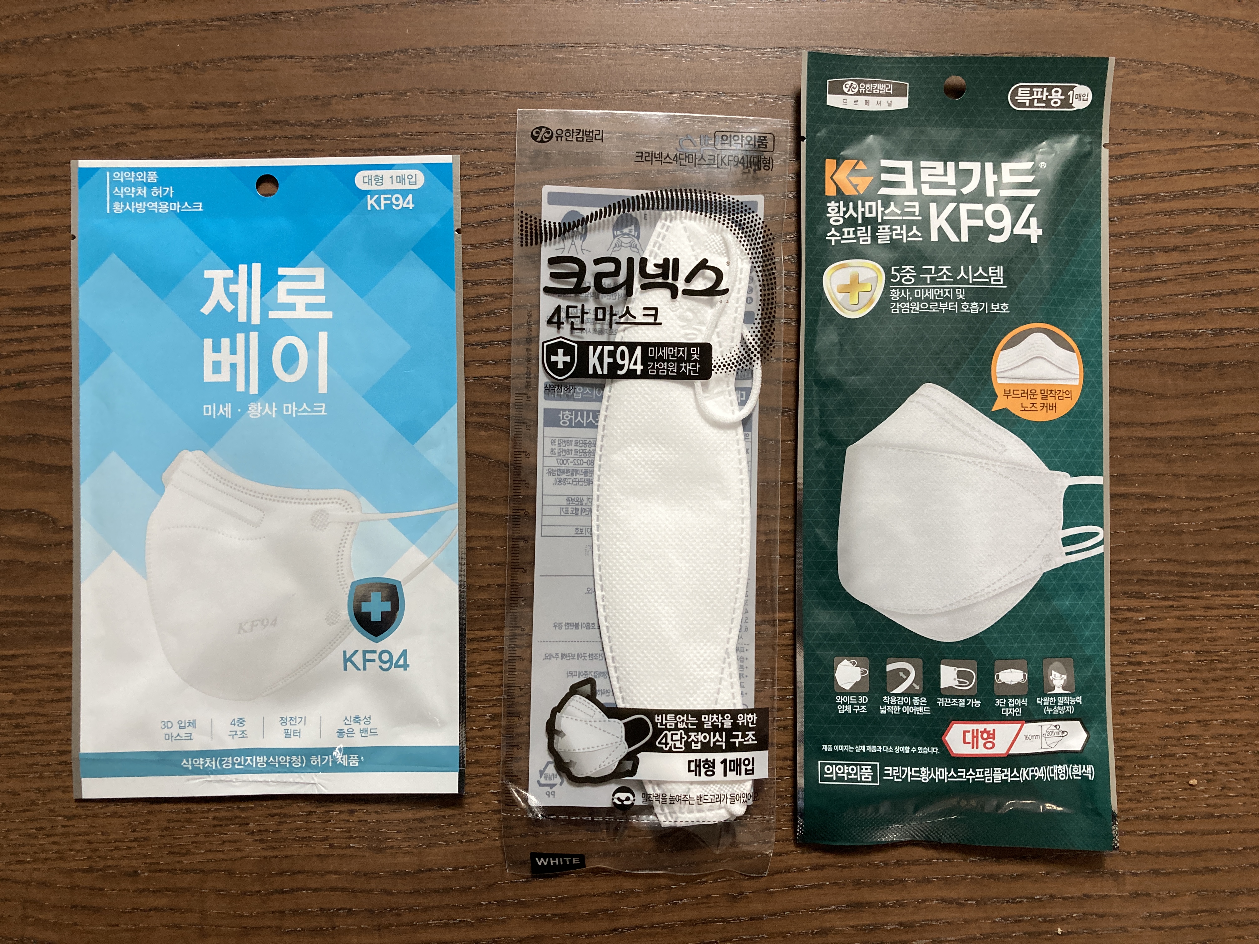 유한킴벌리 크린가드 수프림 플러스 KF94 : 착용감은 정말 편안하다. 하지만 새것을 써도 한 열흘 정도 쓴 마스크 처럼 보이는 단점이 있다. 새것을 까서 썼는데 주변에서 '마스크 좀 새걸로 바꿔라' 소리를 듣기도 함. 성인 남자 얼굴 큰 사람도 편하게 쓸 수 있다.