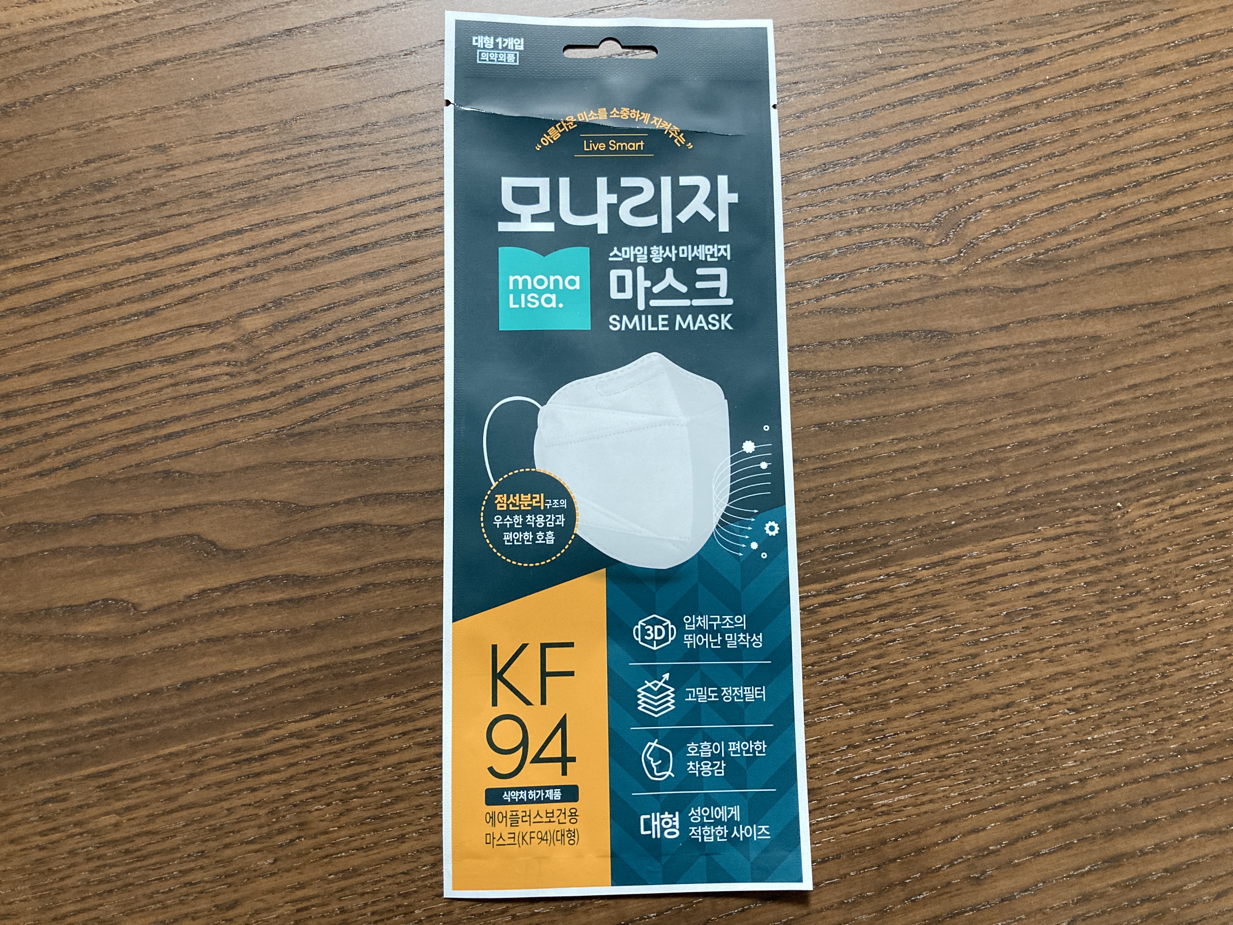 모나리자 스마일 KF94 마스크 : 가볍다. 모서리가 약간 꺼끌꺼끌하다. 가격이 저렴하다면 써 볼만 하다. 성인남자 얼굴이 큰 사람에겐 약간 비추.