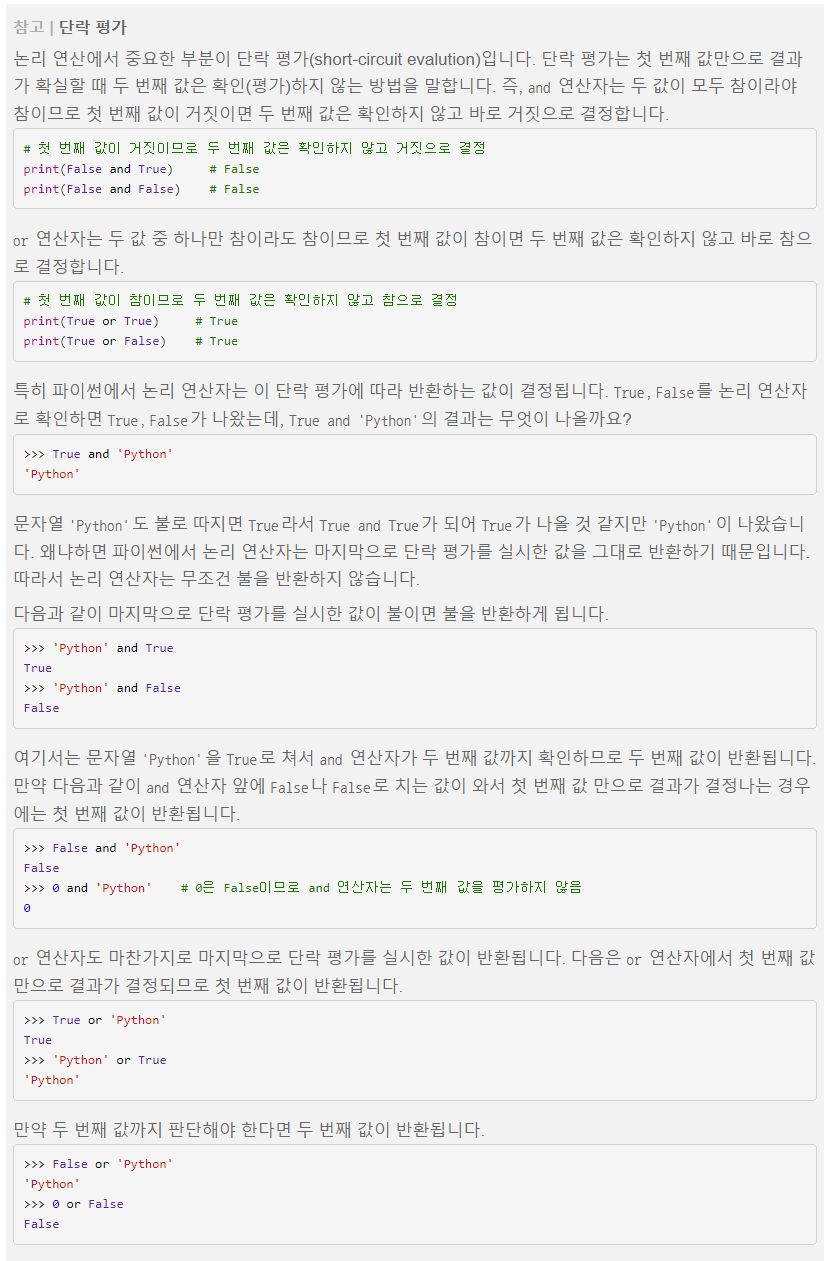 True and 'Python' ---> 'Python'이 된다는 건 이해가 잘 되지 않는다. False or 'Python' ---> 'Python' 이 되는 것도 잘 이해가 가지 않는다.
