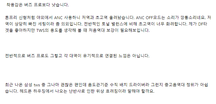 착용감은 버즈 프로보다 낫습니다.톤프리 신형처럼 야외에서 ANC 사용하니 저역과 초고역 올려놨습니다. ANC OFF모드는 소리가 깡통소리네요. 저역이 상당히 빠진 세팅이라 좀 의외입니다. 전반적