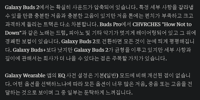 위의 engadget.com의 글에서도 갤럭시 버즈 2가 버즈 프로에 비해 저음이 부족하고 Flat하다라는 내용을 적고 있다. 아래는 구글번역기를 돌린 결과다.