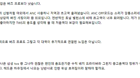 개인적인 생각이지만, 해상력이 너무 심각할 정도로 좋지 않게 들렸다. 심지어 갤럭시 버즈 플러스와 비교해도 떨어진다고 생각한다. 영디비의 유명하신 분도 리뷰에 비슷한 의견을 얘기했었다.