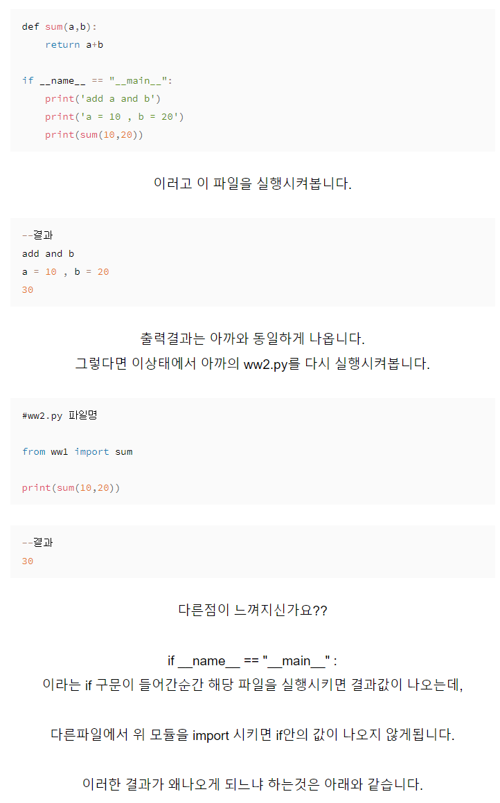 결론을 짓자면 모듈에 if __name__=="__main__"이라는 조건문을 넣어주고 그 아래는 직접 실행시켰을 때만 실행되길 원하는 코드들을 넣어주는 것으로 생각하면 쉬울 것이다.