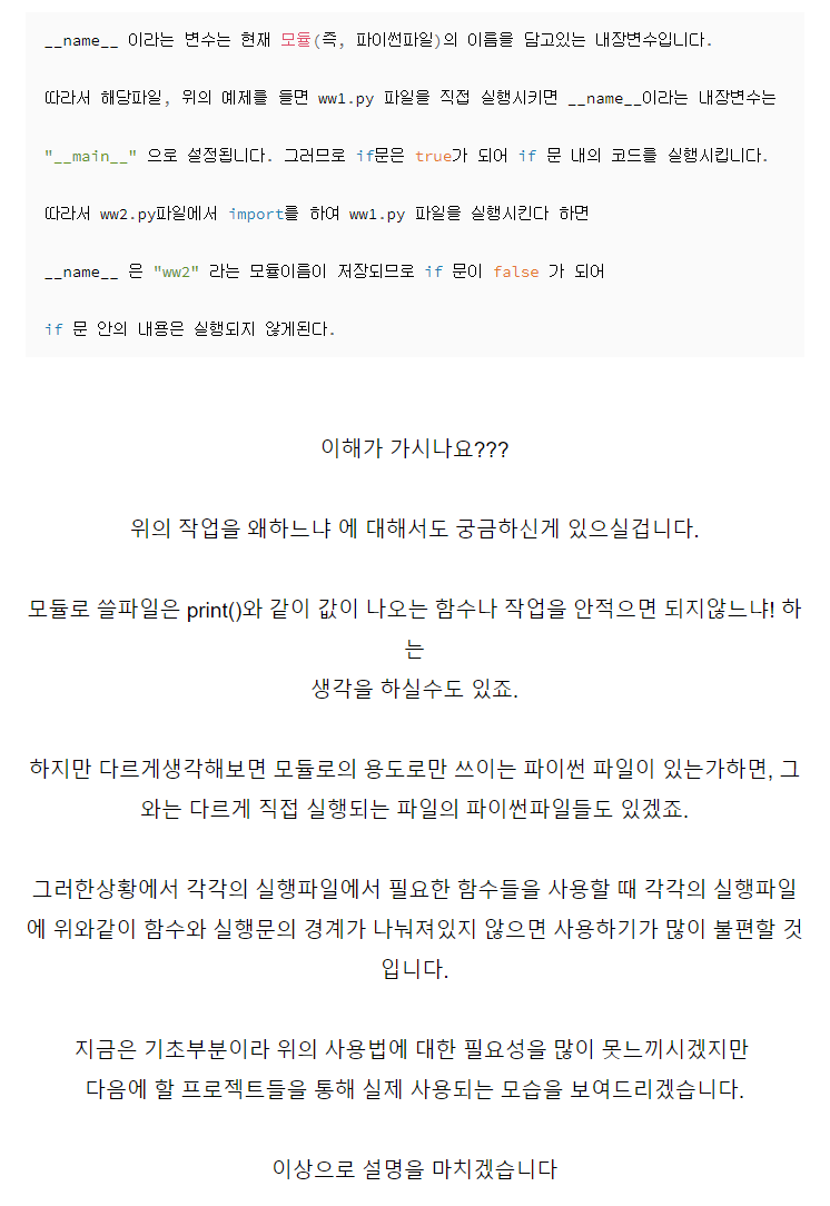 이상입니다. 위에 설명 드린 대로, 현재 코드를 실행하는 파일의 위치에 따라, "__name__" 의 이름이 바뀌므로, 이 부분을 활용하여, 다른 코드에 있는 함수를 이용할 때, 코드를 구현하시면 됩니다.