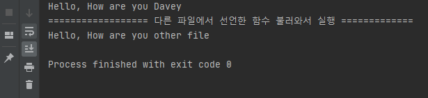 - 위 코드를 실행을 시켜 보면 아래와 같은 결과 값을 보실 수 있습니다. 아래 결과 값을 보시면, 우리가 의도하지 않은, "Hello, How are you Davey" 까지 출력이 되는 걸 확인 하실 수 있습니다. 이런 현상 때문에, 위에 "if __name__ == '__main__' :" 의 조건문을 활용을 하는 것입니다.