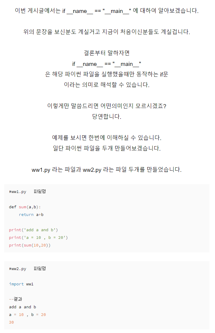 파이썬 초심자가 if __name__ = "__main__"의 의미를 이해하는 데에 상당한 어려움이 있을 듯 하다. 해서 인터넷을 검색해본 결과 여기에서 아주 좋은 글을 발견하여 일부를 인용한다.