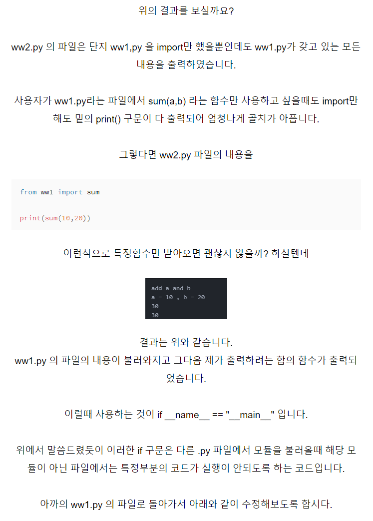 결론을 짓자면 모듈에 if __name__=="__main__"이라는 조건문을 넣어주고 그 아래는 직접 실행시켰을 때만 실행되길 원하는 코드들을 넣어주는 것으로 생각하면 쉬울 것이다.