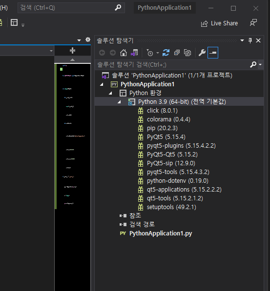 ① 아나콘다를 정상적으로 설치했을 경우, 비주얼 스튜디오에서 솔루션탐색기에서 Python 3.9 항목을 우측클릭하면 Python 패키지 관리가 나온다. 여기에서 PyQt5와 PyQt5-tools를 설치하지 않았을 때 많은 에러가 생기면서 실행되지 않는다.