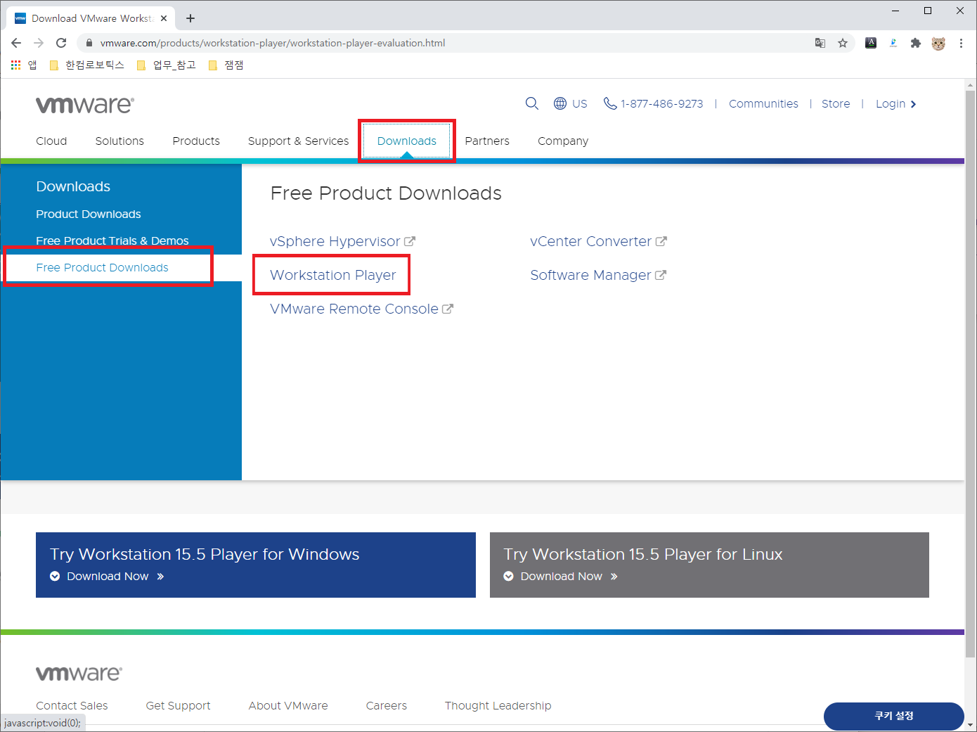 홈페이지에서 Downloads → Free Product Downloads → Workstation Player 메뉴로 이동합니다.