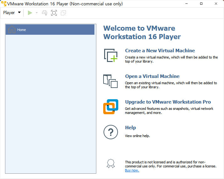 바탕화면에 생성된 VMware아이콘을 실행하여 VMware를 최초로 실행하면 아래와 같은 화면을 볼 수 있습니다.