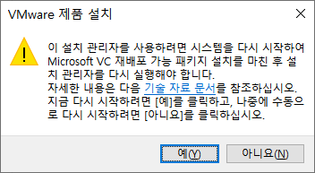 실행 시 간혹 Microdoft VC 재배포 패키지 설치로 인해 재부팅을 해야 하는 경우가 있습니다. 재부팅을 하지 않으면 더 이상 진행이 되지 않으니 아래와 같은 창이 나타난다면 "예"를 클릭하여 재부팅을 한 후 설치를 이어가시면 됩니다.