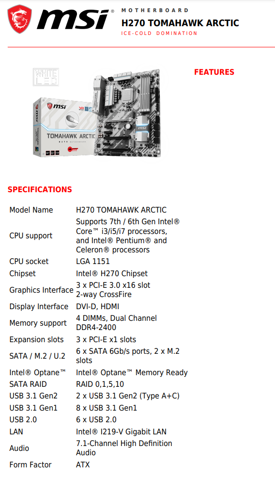 MSI H270 TOMAHAWK ARCTIC 메인보드 스펙을 백업해둔다. 언제 홈페이지에서도 사라질지 모르니..