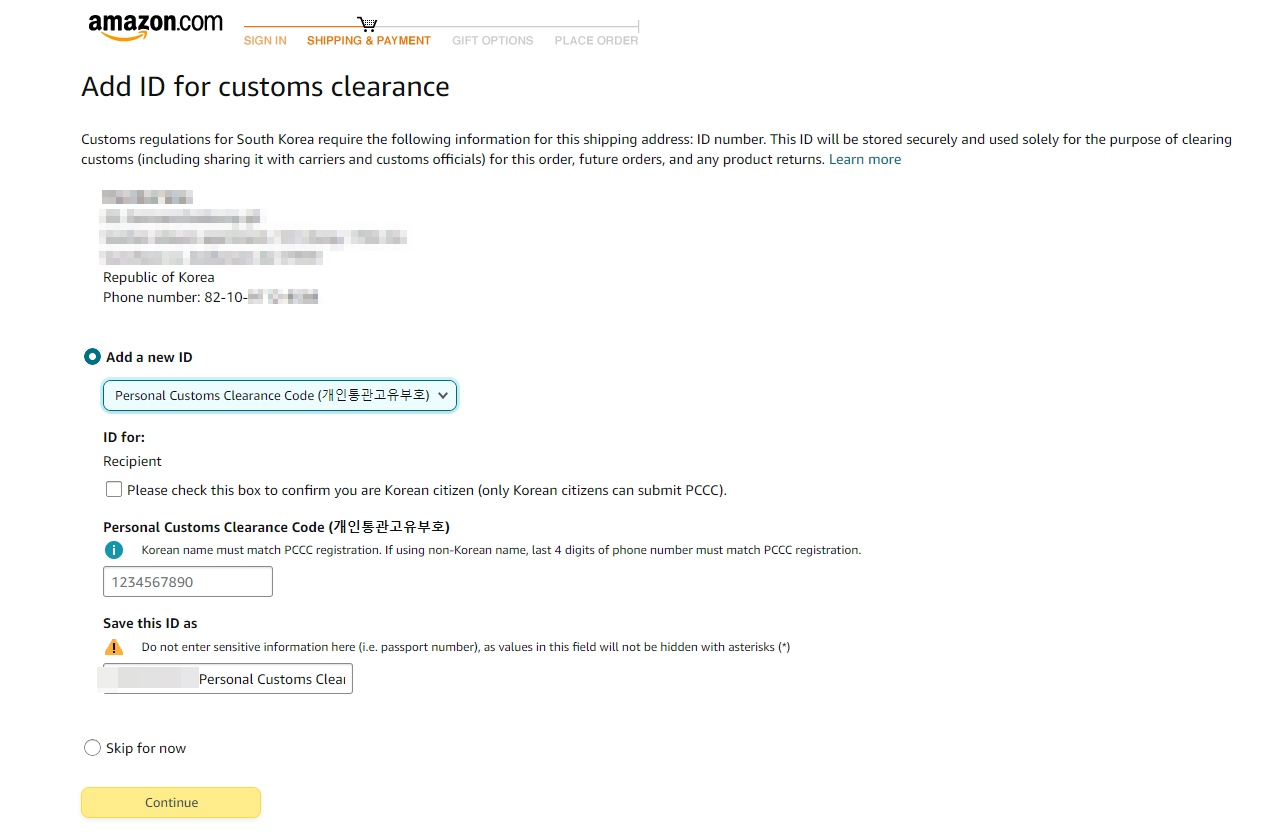 구글 크롬으로 한국에서 미국 아마존으로 들어가 쇼핑을 하던 도중에 결제카드입력, 주소입력 후 개인통관고유번호를 입력하는 창이 나오는데 거기서 먹통이 발생한다.