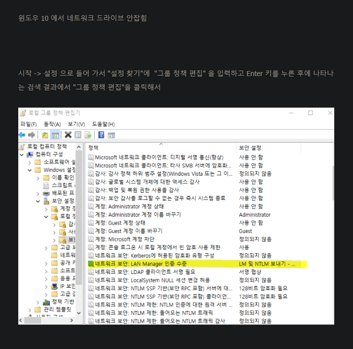 아, 물론 프로그램 설치에서 윈도우 기능 추가에서 SMB 1 을 켜주는 거 잊지 말아야