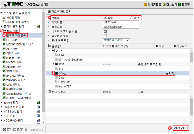 아래 그림의 ①~⑤순서와 같이 [서비스 관리] –> [윈도우 파일공유] 메뉴에서 서비스를 실행 후 접속할 폴더를 지정합니다.
