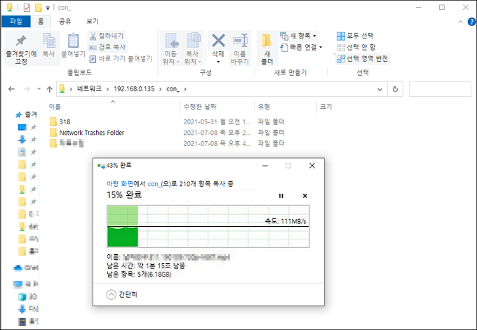 1. 윈도우 파일공유(SMB)의 속도는 단일1GB 이상의 파일로 복사하여 확인 할 수 있습니다.
