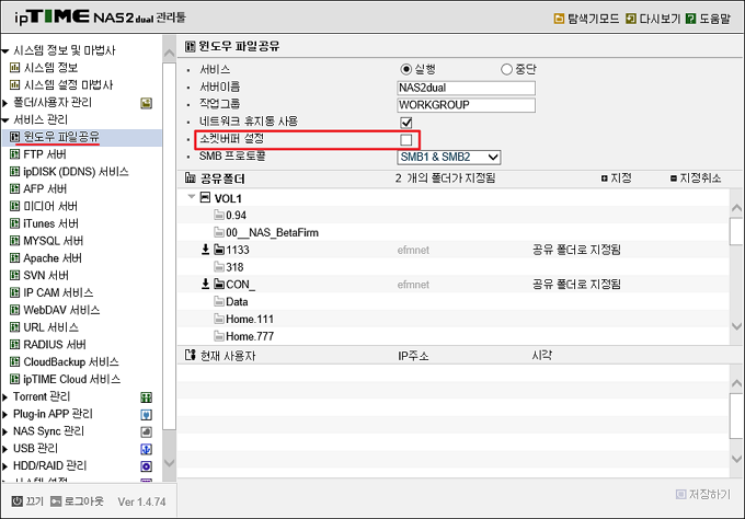 아래는 ipTime 매뉴얼 중 필요한 부분을 백업한 것이다. 펌웨어를 업데이트 하지 않으면 아래 설명에서 소켓버퍼 체크박스가 나타나지 않고 SMB1/SMB2설정도 나타나지 않는다. 아무래도 ipTime측에서 펌웨어 업데이트를 하면서 슬그머니 윈도우 폴더 접속시 오류 문제가 나지 않게 해두지 않았나 싶기도 하다.