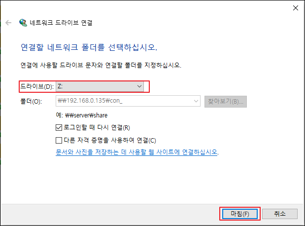 ② 드라이브 경로를 지정 후 마침을 클릭합니다.