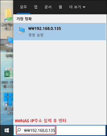(1) 윈도우 돋보기 창 또는 윈도우 실행창에서 NAS IP주소를 입력하여 접속합니다.