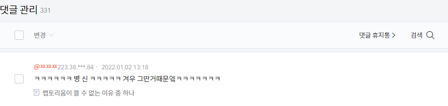 - 2022년 1월 2일 13시 18분 욕설을 포함한 악플이 달려서 사이버경찰청에 신고했다. 로그인하지 않아도 댓글을 쓸 수 있다고 해서 욕댓글을 달아도 경찰조사가 불가능할 것이라고 생각했는지 참... 아이피 백번 우회해도 글 내용만으로 24시간 안에 범인 실제위치를 아주 쉽게 찾아내는 시대라는 걸 모르는 듯. 이것으로 랩토리움에 물린 사람들의 수준을 알 수 있다.