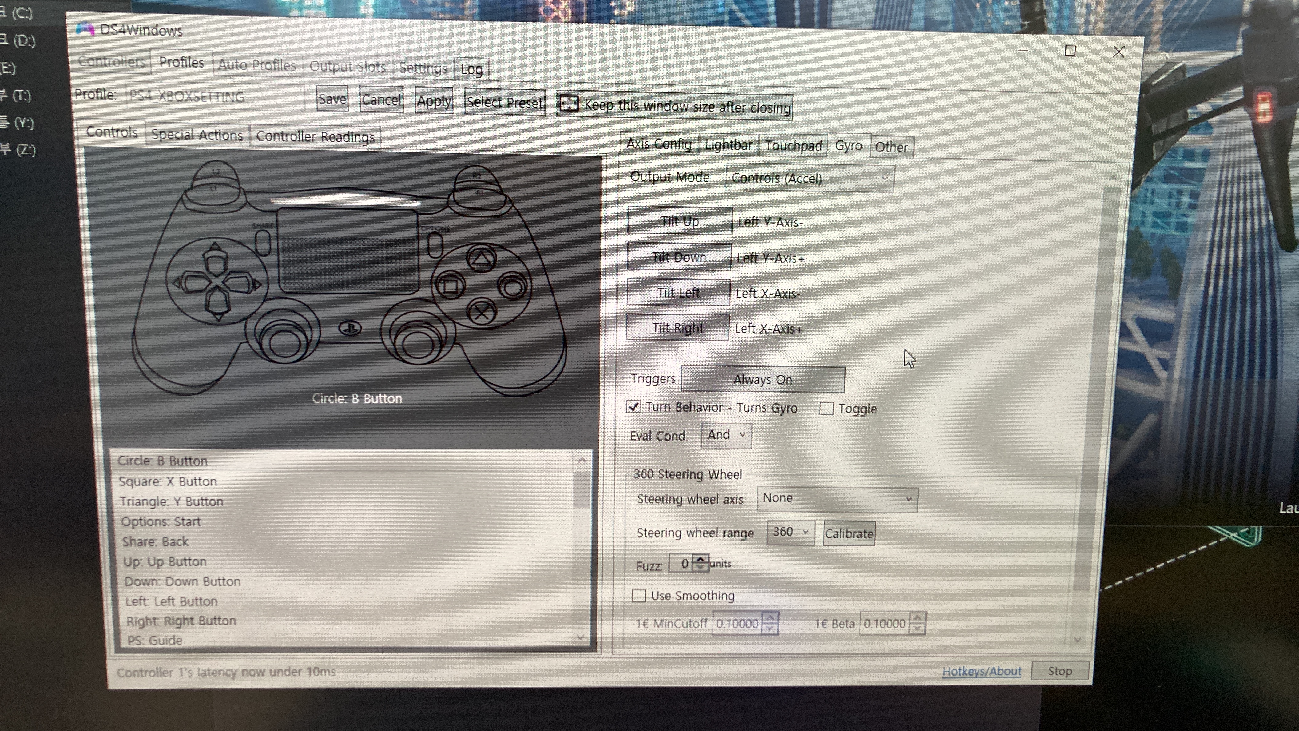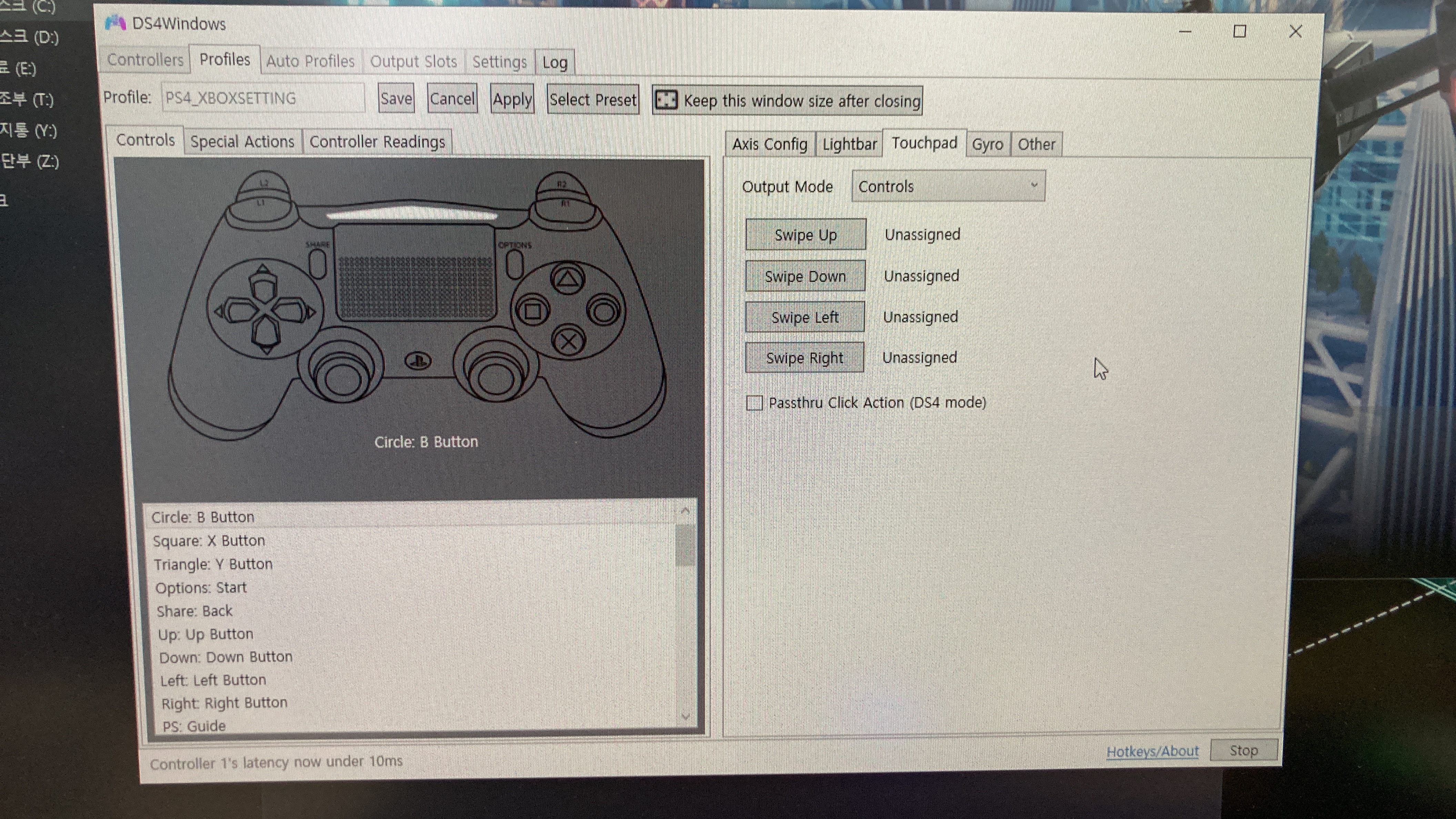 DS4windows을 실행해서 install DS4 driver를 하고 나머지 필요한 것들을 설치하고 나면 DS4windows에서 preset을 이용할 거냐고 물어본다. 이때 preset을 이용한다고 한 후 PS4 controller를 선택한다고 하지 말고 XBOX 콘트롤러를 사용한다고 선택해야 한다.