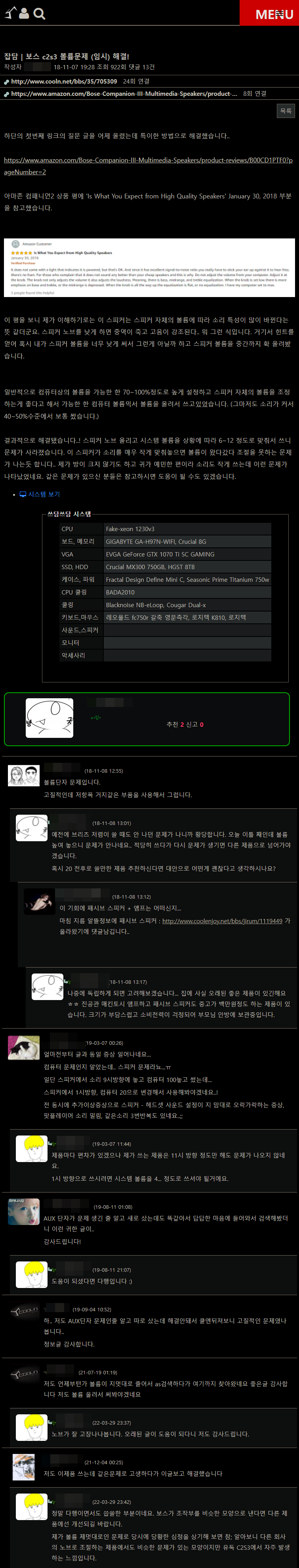 참고가 된 게시글은 보스 c2s3 볼륨문제 (임시) 해결! > 사운드 장치 | 쿨엔조이 (coolenjoy.net) 이 게시글이었다.