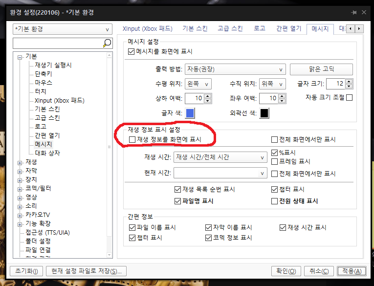 재생 정보 표시 설정 이라고 있고 그 바로 밑에 재생 정보를 화면에 표시 라는 체크박스가 있다.