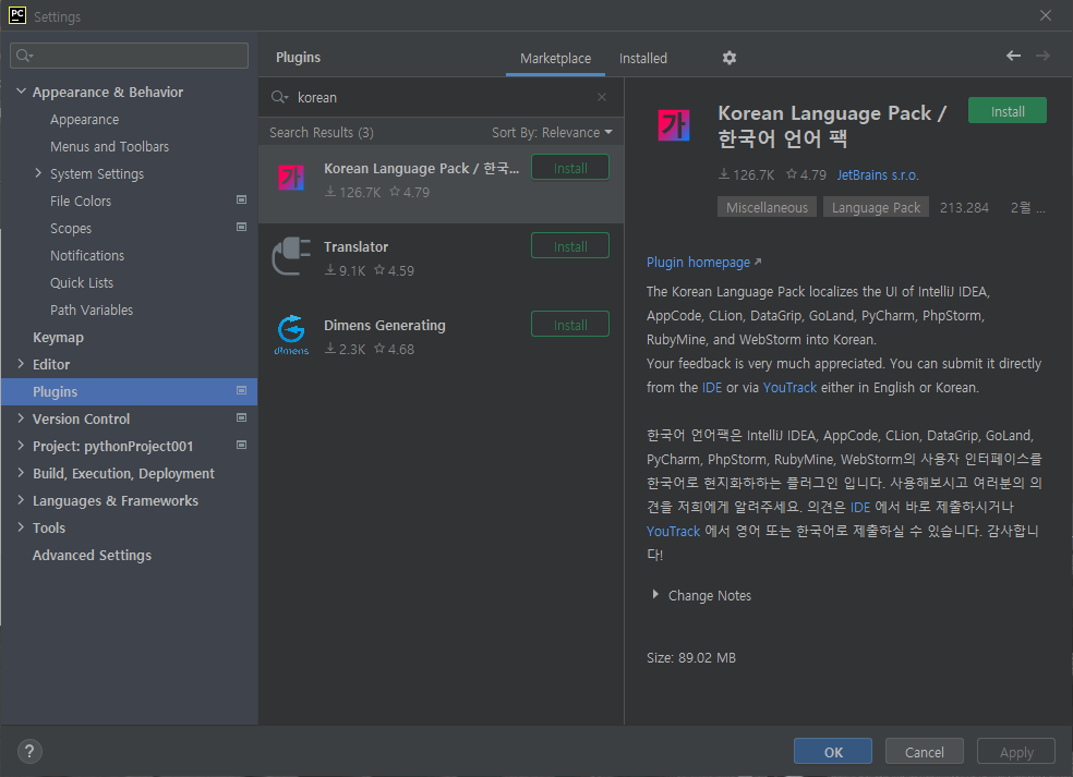 settings에 Plugins에 가서 검색을 korean으로 하면 한글랭귀지 팩이 보일 것이다. 그걸 설치한다.