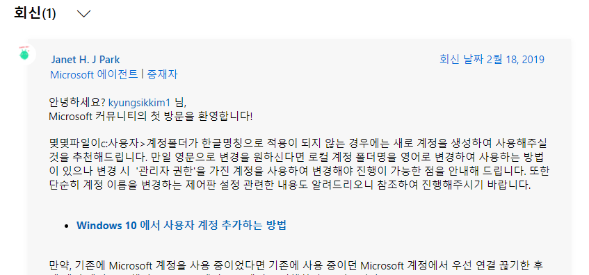 바보같은 윈도우 10은 사용자 이름 변경이 제대로 먹히지 않아 추천하지 않는다는 글이었다.