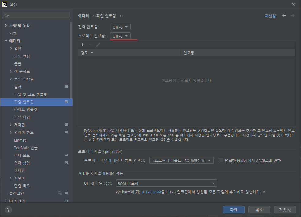 파이참 UTF-8 설정