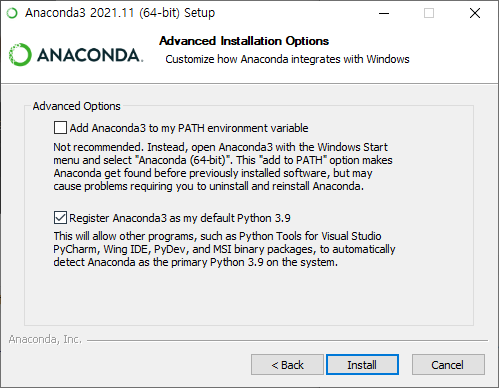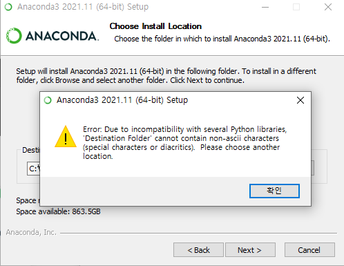 아나콘다 설치폴더를 C:\anaconda3 등으로 바꿔주면 설치가 된다. (설치파일을 실행할 때 관리자 권한으로 실행해야 한다)