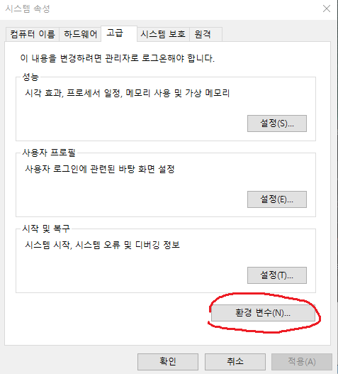PATH에 추가하는 것은 윈도우 10 왼쪽 아래 검색창에서 '고급 시스템 설정'으로 검색하고 들어가면 고급탭에 환경변수가 있다. 그걸 클릭한다.