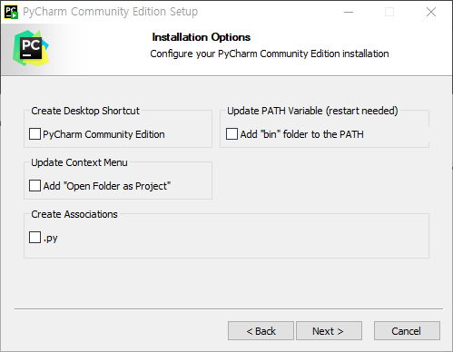 여기서 Create Desktop Shortcut 에 체크하고, Add "bin" folder to the PATH에 체크한 후 Next를 눌러 진행한다. py파일을 파이참으로만 열고 싶으면 Create Associations에 체크하면 된다.