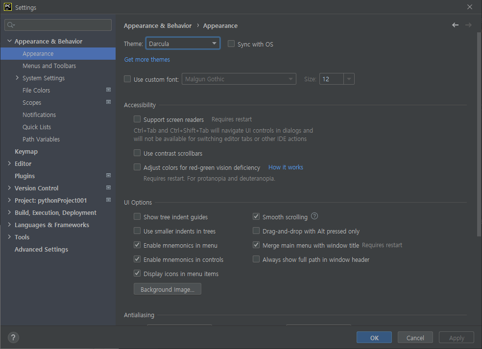 파이참 프로그램의 테마는 Settings에 Appearance에서 변경할 수 있다. 보통 처음에 설치하면 드라큘라... 아니 Darcula로 되어있는데 대부분이 이 테마를 즐겨 사용하는 것 같다.