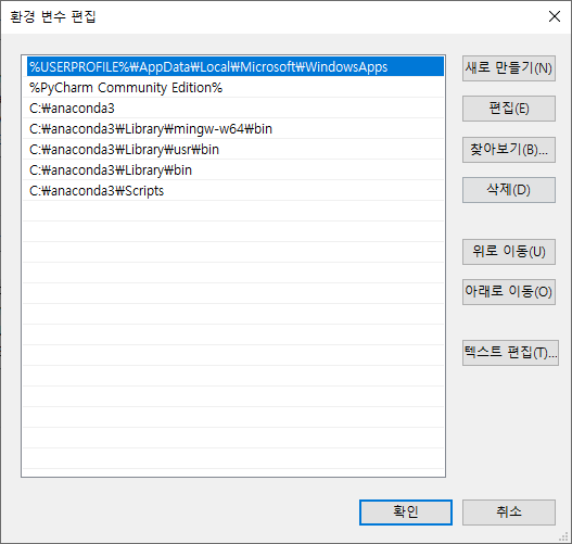 검색해보니 무슨 PATH에 아나콘다 관련한 아래의 경로들을 추가하라는데...