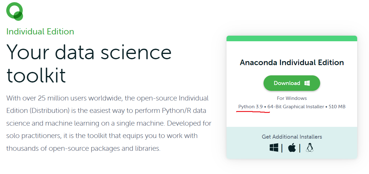 그런데 자세히 보니 파이썬 3.9라고 나온다. 현재 파이썬의 최신 버전은 3.10.2 인데.... 개발환경을 구축할 때 아나콘다 기능을 제대로 다 쓰려면 3.9로 맞춰야 할 것같은 느낌적인 느낌을 받을 수 있다.